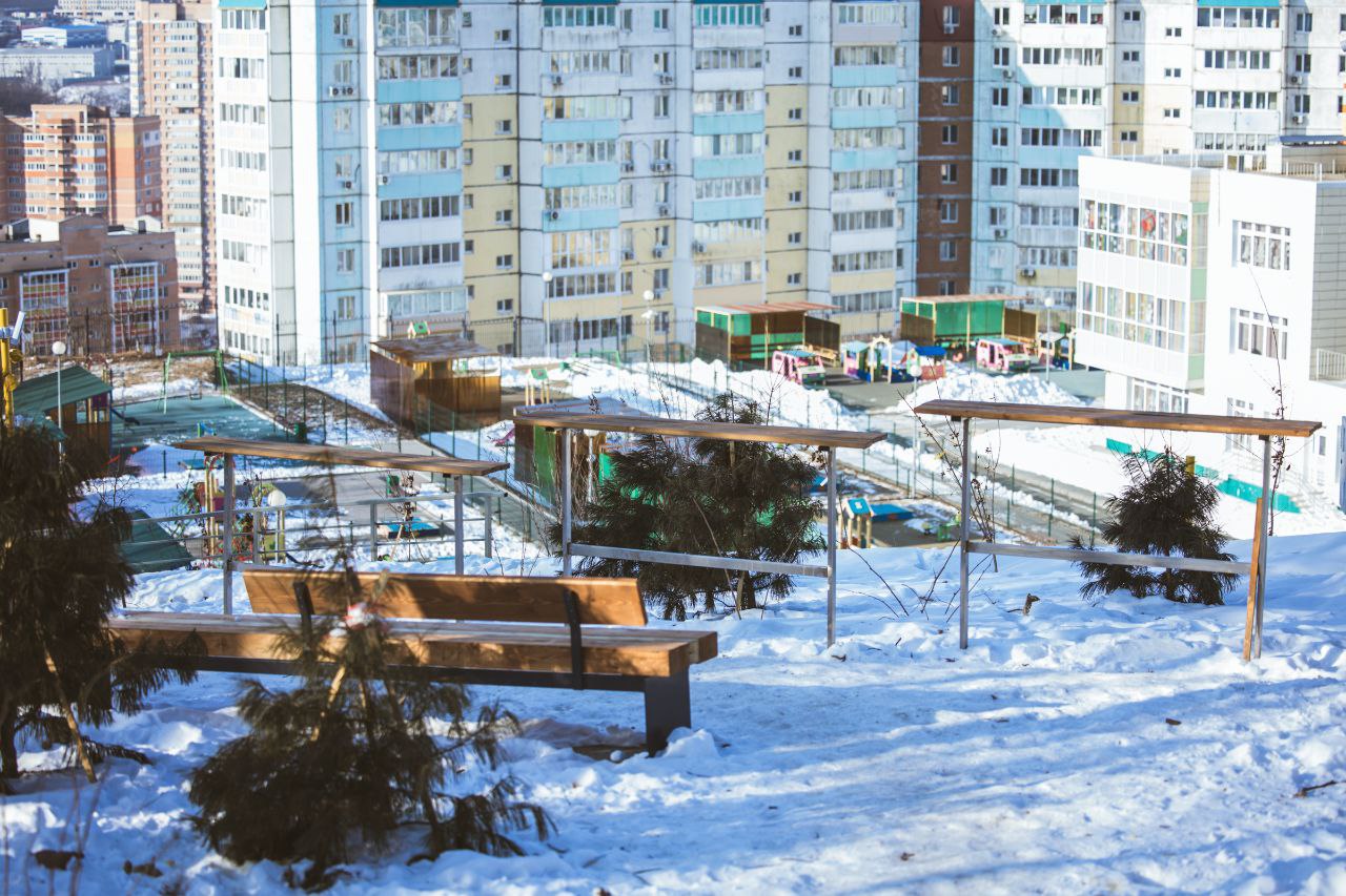 Завершается благоустройство верхней части парка Снеговая падь в районе улицы Анны Щетининой, 30. Сейчас в общественном пространстве монтируют навесы и детское игровое оборудование, устанавливают лавочки, урны и другие элементы парковой инфраструктуры.